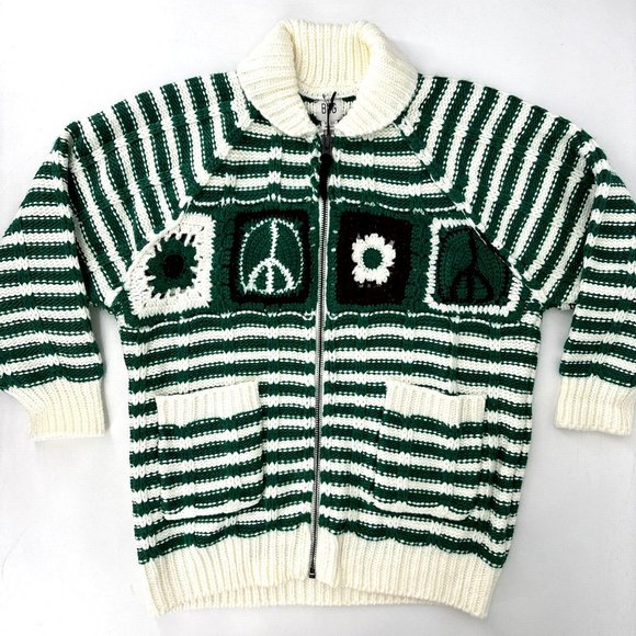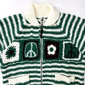 UO BDG Crochet Knit Zip Up Cardigan Sweater Patchwork Green Peace NWT $148 sz XS