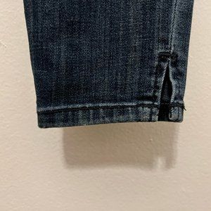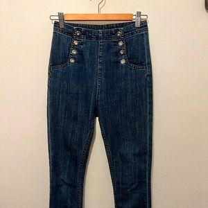 Super tight, high-waisted jeans with a sailor style button-flap front and ankle slits. These are ankle length unless you're short like me (5'2"). Buttons are metal. Jeans are in great used condition. Look great on! From a smoke free, pet free home.