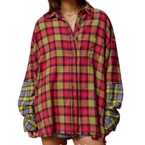 Urban Outfitters One Way or Another Plaid Flannel Oversized Pink Purple Green Yellow Button Down Casual Shirt with raw hems and intentional distressing