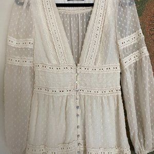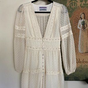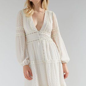GORGEOUS off-white plunge V-neck Kimchi Blue maxi dress from Urban Outfitters. Was bought for original $129. Very bohemian-chic, like what Serena Van Der Woodson from Gossip Girl would wear. Size X-Small in original condition and never worn before. Can be elevated with a pearl necklace for a semi-formal event or dressed down with sneakers for a night out with the girls (or boys!). price is negotiable.