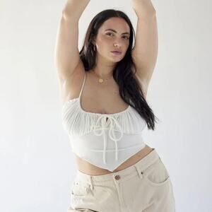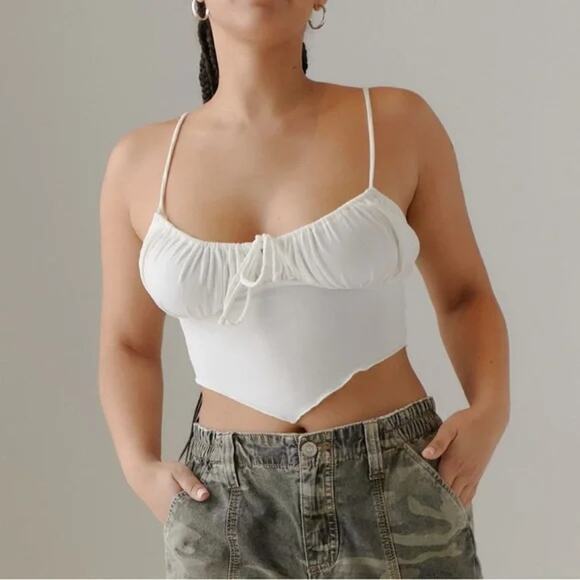 Cropped above the waist. Topped with ruching at the bust and a pointed hanky hem. Only available at Urban Outfitters.