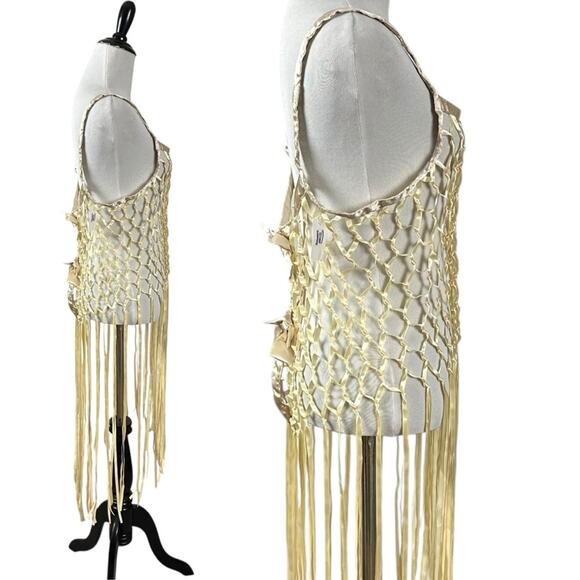 Ultra-femme layering piece from UO. Netted ribbon silhouette with bow detailing. V-neck with long, swingy fringe we love.