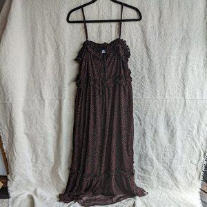 Ditsy floral dress from Urban Outfitters. Printed floral pattern on black and red chiffon. Mini ruffles at neck and bust, with a tiered long skirt. Keyhole cutout at front with ties. Adjustable skinny straps.