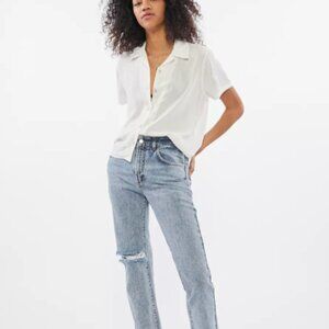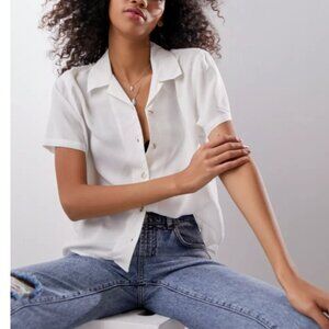 Sleek + chic button-down top from Urban Outfitters. Made from a woven fabrication in a slim-cut, button-down construction. Topped with a pointed collar + short sleeves. Perfect for tucking into your favorite bottoms or tying at the front for a casual-cool look.