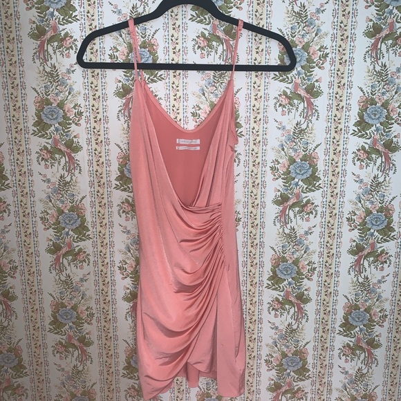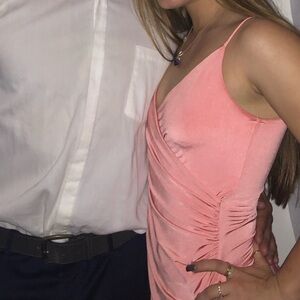 Fun short party dress. Is a bright pinky salmon color and is great for a nice formal occasion or cocktail party! Super stretchy and comfy to dance all night in!