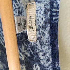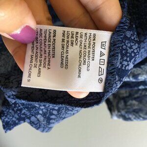 Pretty Urban Outfitters top in shades of blue. Four functioning buttons down the center. Ruffle toward bottom in a cute contrasting pattern. High low hem. Excellent used condition!