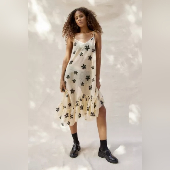 Flowy midi dress from UO in an effortless shift silhouette. Crafted from a lightweight fabric with a semi-sheer finish and designed with a v-neckline, low-cut sides and a ruffle at the hem. Complete with adjustable tied straps and shiny sequin motifs scattered throughout. Urban Outfitters exclusive.