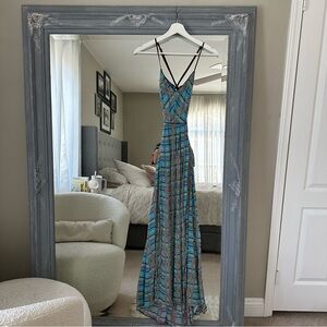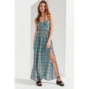 Breezy, lightweight dress in funky plaid pattern. Fitted front, loose skirt, open back with adjustable shoulder straps. Lace up back is a separate string from the shoulder straps, making the dress very adjustable