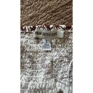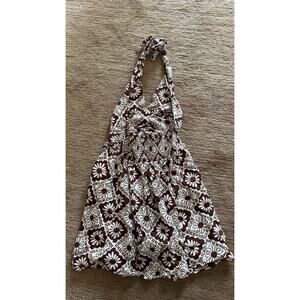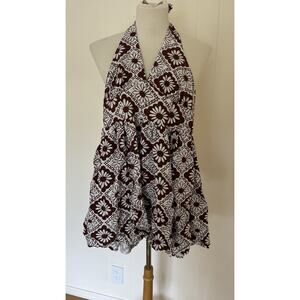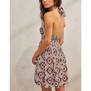 The UO Halter Mini Dress in size S features a beautiful floral pattern with a brown color, perfect for a casual summer occasion. Made from viscose knit fabric, the dress has a sleeveless halter neckline and a button closure. It is a fit & flare style with a short length, featuring a backless and lightweight design with smocked details, adding an angelic and Barbie-like touch to the overall bohemian and aloha theme.