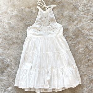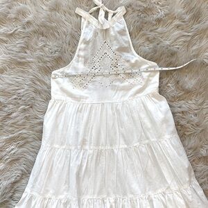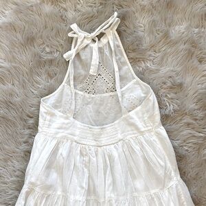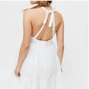 Airy cotton mini dress from Urban Outfitters topped with a tie halter neckline. Babydoll silhouette fits slim through the bodice before fanning with a tiered ruffle skirt.