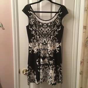 This thick and stretchy black and white cap sleeve mini dress has a flattering seam at waist. The back neckline is slightly lower than front.