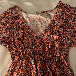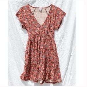 Outfitters made from a stretchy knit. Trimmed with a deep V-neck, short cap sleeves and tiered ruffle skirt.