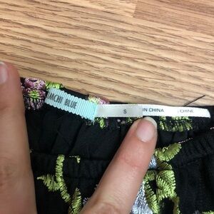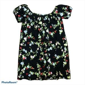 Description: black babydoll mini dress mesh overlay with floral embroidery off the shoulder puffy sleeve elastic along shoulders