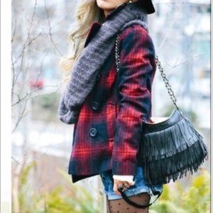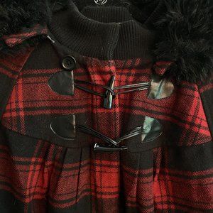 Gorgeous buffalo plaid hooded peacoat that has a punk rock/alternative feel to it. Features a front zip with two pea coat buttons on the top. Worn twice, gently used. The hood is oversized and removable. Very heavy and warm with two front pockets. Comes from a clean, smoke-free home. Colors: Red/Wine/Black