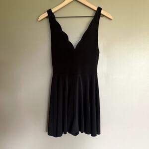 Urban Outfitters Kimchi Blue Rochay Knit Scalloped V-Neck Playsuit, Black, Short Jumpsuit, One Piece, Romper, Sleeveless, Pull On, Stretch Jersey, Full Swingy Shorts, Scalloped Detail at V-Neck and V-Back, Mini Length, Excellent Condition with No Flaws.
