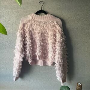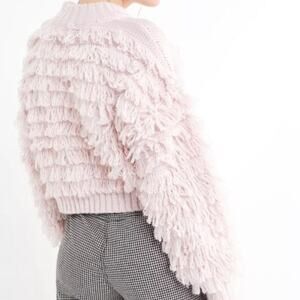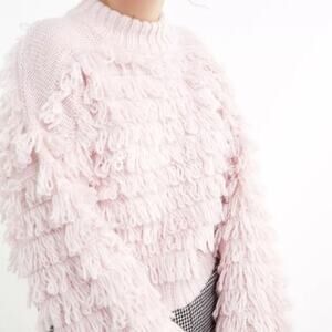 Textured pullover sweater from UO. Built from a soft knit with tiered fringe detailing. Topped with a ribbed mock-neck and dropped long sleeves for a relaxed fit. Finished with ribbed banding at the cuffs and hem.