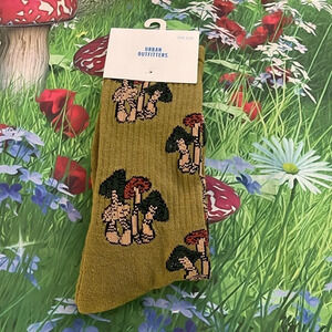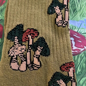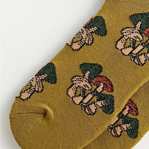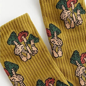 Allover mushroom pattern crew socks, only at Urban Outfitters. Fitted with a ribbed knit ankle cuff.