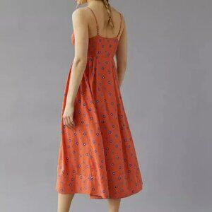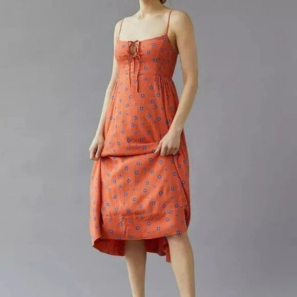 UO Nicolette Smocked Red & Blue Floral Midi Dress Orange Spaghetti Straps Size M