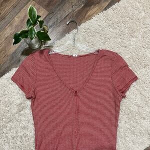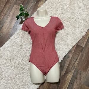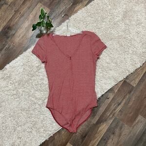 UO Out From Under Medium Red Beige Ribbed Striped V Neck Half Zip Bodysuit