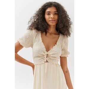 Vintage-style picnic dress. Features a V-neckline, short sleeves, a ruched bust and floaty skirt with a midi-length hem. Complete with self-tie centre to bust and ruffle tiered hem.
