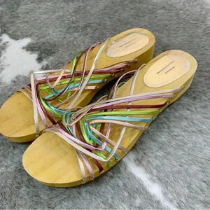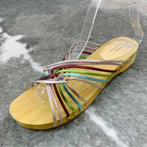 Here’s a super fun pair of shoes by Urban Outfitters. These are the rainbow leather Strappy slide sandal style in a size 38, which according to their size chart is equivalent to a size 7.5. Great shape, some light wear from regular use. Love the wooden bottoms, makes for a fun retro clog style! :)