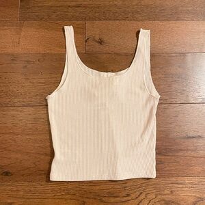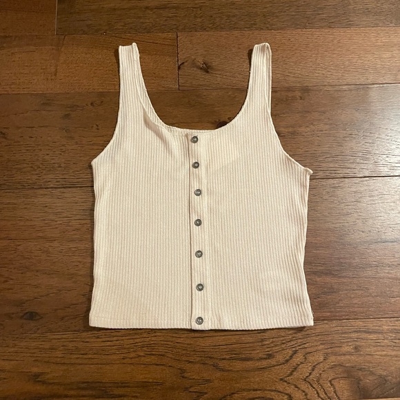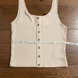 Cream colored ribbed tank/crop. Buttons in the front but they aren’t functional. I’m typically a small and this fits well. From Urban Outfitters. New with tags.