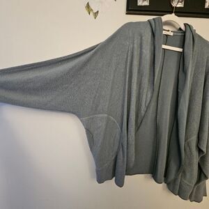 Fuzzy hooded cardigan with oversized fit and dolman sleeves. Can fit up to a med/large easily.