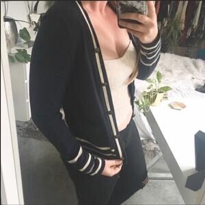 UO Silence Noise Navy Blue White Stripe School Girl Open Cardigan Sweater L