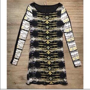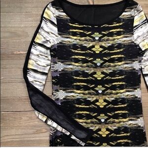 Silence + Noise from Urban Outfitters. X-Ray Dress. Long sleeves. Stretchy and form fitting. Mesh accents on the upper back and sleeves. Abstract mirrored print. Excellent condition. Shoulder to hem is approximately 32”. Size XS.