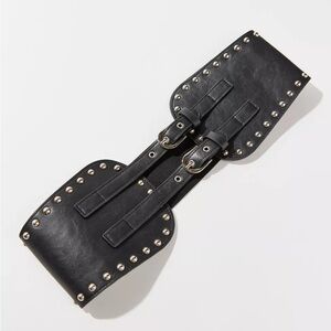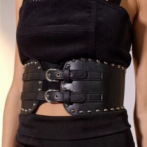 Faux leather belt in a wide corset-inspired silhouette. With studded detailing it's wrapped with a double-buckle closure. Elastic at the back for a comfy stretch fit.