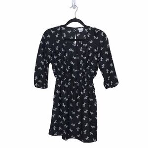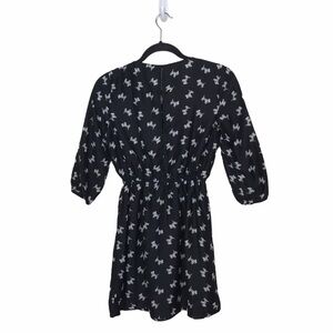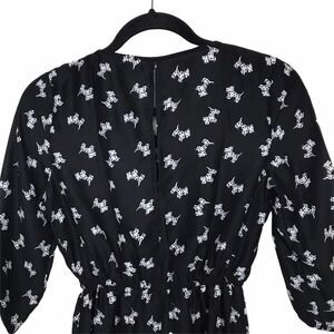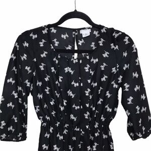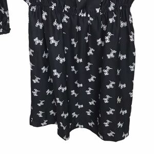 Black dress with white dog print. Has key hole opening on back. 3/4 sleeves. Elasticated waist stretches. Preowned but in good condition.