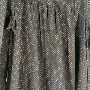 Long sleeve button cuffs, Peter Pan collar with ruffle hem, pockets, full front button closure, muted black with ditzy blue and burnt orange flowers. NWT