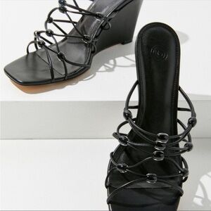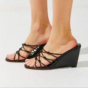 Beaded wedge sandal by Urban Outfitters to take your summer styling up a notch. Faux leather construction featuring a square toe, coated sole and strappy upper connected by beads.