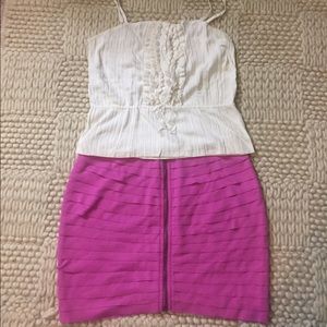 This is a fushia pink color skirt. It's new without tags. It has a zipper in the front and its asymmetrical. The bottom is not straight. It goes up in the middle.