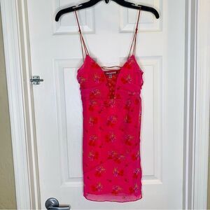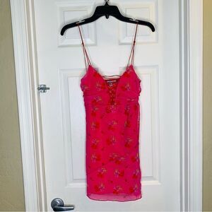 A printed mini dress with a mesh overlay. Slim fit. Complete with a lace-up detail at the bust and a notched hem. UO exclusive.