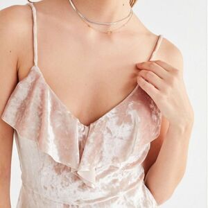 Crushed velvet romper from Urban Outfitters is made from a luxe velvet in a curve-skimming fit. Topped with a low v-neckline that features ruffle detailing + adjustable shoulder straps. Finished with a high-rise, relaxed-fit shorts bottom, a tie-back + hidden zipper at the reverse.