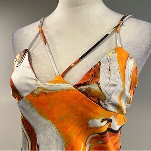 Stunning dress with a vibrant abstract print. Features a mix of orange, black, and white colors. Perfect for a bold look.