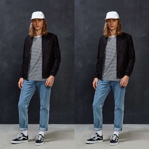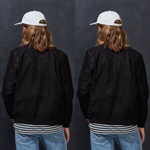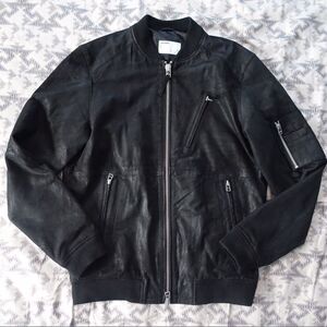 Your Neighbors Marius Leather Bomber Jacket- Black. Modern bomber jacket from Your Neighbors. Slim-cut in tumbled-soft premium leather trimmed with rib-knit along the edges. With a zip front and zip pockets at the chest and sleeve. Finished with a full lining. Favoring a modern look. Brand new without tags. Size small.