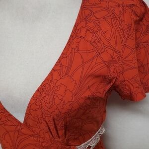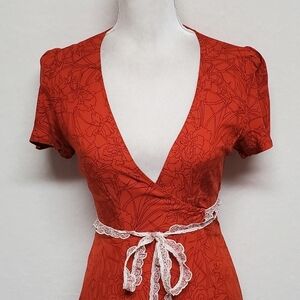 Upcycled Nordstrom Lira Daniella Rust Red Floral Surplice Asymmetric Wrap Dress.