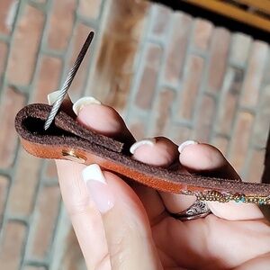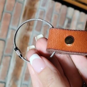 Reimagined (by me) from a vintage Ariat leather belt. Heavy duty cable with barrel clasp makes it easy to add or remove keys.