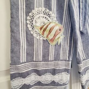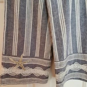 Cool and flowy cotton linen blend ; comfortable fit with elasticized back waistband and flat front. Attached tie belt. One of a kind capris embellished with vintage doilies, lace, and cotton fish and shell appliques. Delicate shell pieces adorn one doily and silver beach charms dangle from the attached tie belt. Hand stitching.