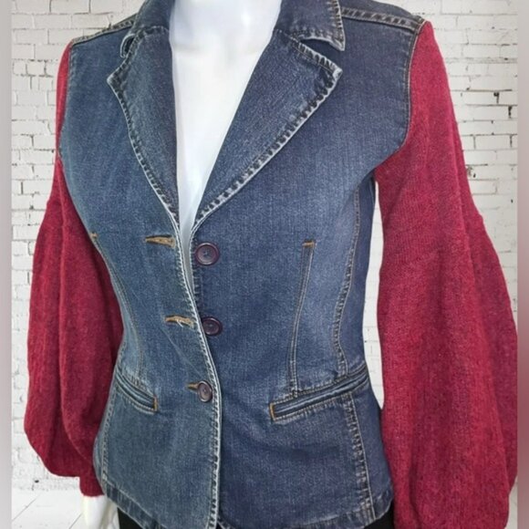 UPCYCLED one of a kind denim blazer Jacket Seven Jeans Sweater sleeves |Size Med