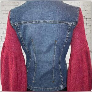 This is a blazer from my upcycled clothing line called “The Southgate EDIT” This blazer combines blue denim with an upcycled Seven Jeans magenta bishop sweater sleeve. It’s gorgeous! Size Medium - Pit to pit is approx 17”