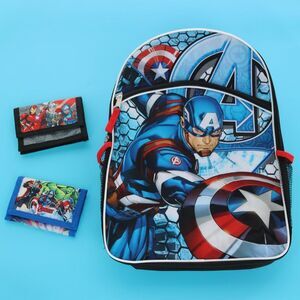 Remember Steve Rogers and brave the new world with this commemorative Captain America backpack. Ready for action- this backpack is jam packed with storage from its front zippered pouch to its side mesh pockets. Back to school or on the go this Captain America backpack has your back. Measures at 12 in. L x 5 in. D x 16 in.. 2 side mesh pockets. Front zippered pouch. Adjustable straps. Steve Rodgers Graphic.