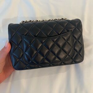 quilted leather, gold hardware, black handbag, classic flap, mini size, authentic, dust bag, vintage Chanel, luxury accessory, soft leather