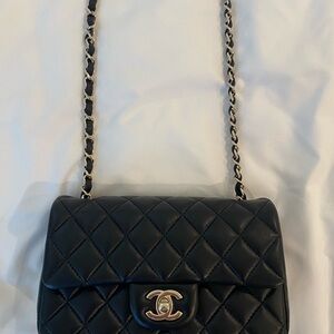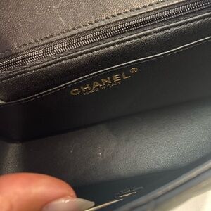 chanel mini flap, great condition. purchased from thrift store in SF. inside has been cleaned, only issue is with the strap- it used to unravel at the bottoms because of the wear so it’s been replaced- can see in last photo. will come with authentic card and dust bag! black leather, very soft, no scrapes or damage. light gold metal. open to offers! not much proof of purchase but was authenticated at thrift store.