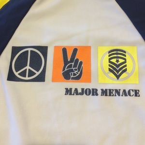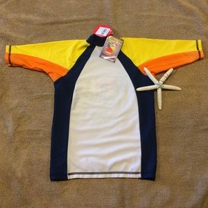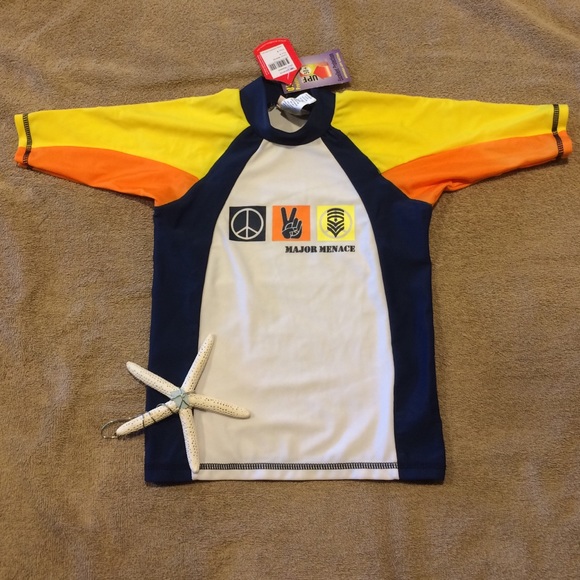 This cute rash guard provides UPF 50+ sun protection. Pull on style. It has a major menace peace theme appliqué on the front. Super comfy and stretchy. Navy, orange, white, and yellow