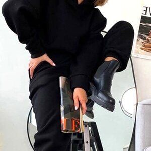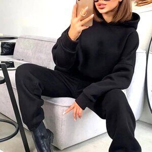 Upscale black velvety feel cropped sweatshirt and gathered sweatpants. Has a hood. The sweatshirt is gathered at the waist. Very sexy activewear coordinated set. Wear with high boots, fancy kicks, ballet slippers. Really fashionable. NWOT. Size large.