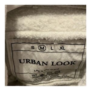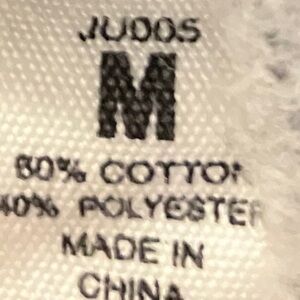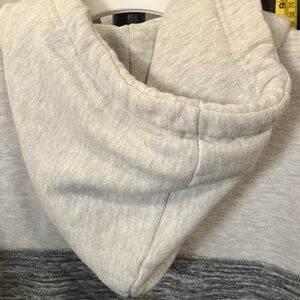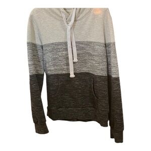 Cotton/polyester 60/40 blend. Gradients of grey. White drawstring around neck. Striking sweatshirt.