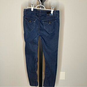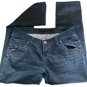 Dark denim with distressed look. Nice pocket detailing. Low rise. Slim fit. Melrose fit.